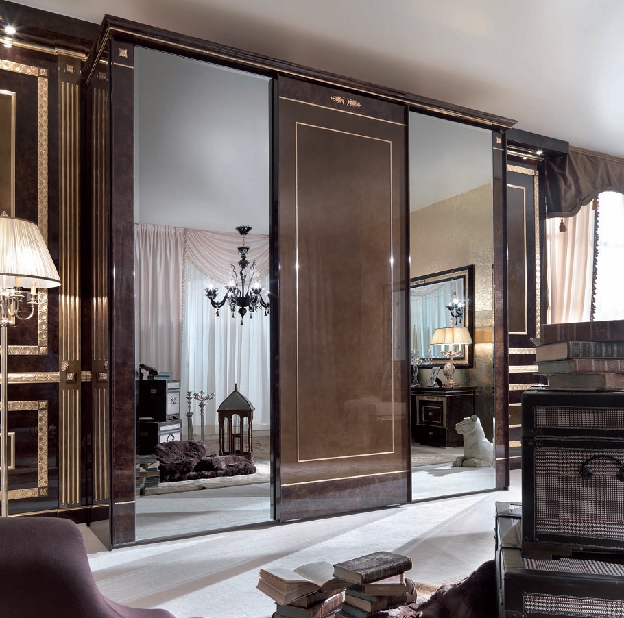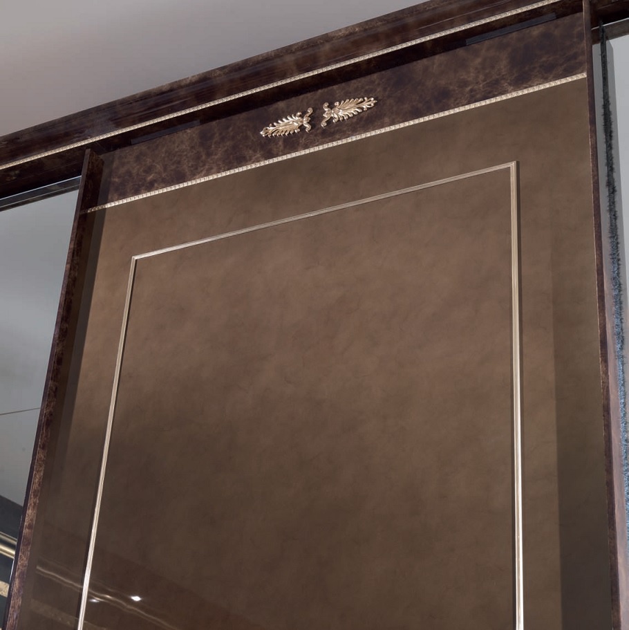 The Arcade Royale Cabinet from the Italian manufacturer Turri. The handmade decor. Finish - glossy, dark brown with a pattern of tree root. Side access doors are manufactured with engraved bevelled mirror. The inner part is made of wood. Internal fittings: 3 wooden shelves and 4 hangers gilded. Wardrobe with 3 sliding doors made in the classic style.