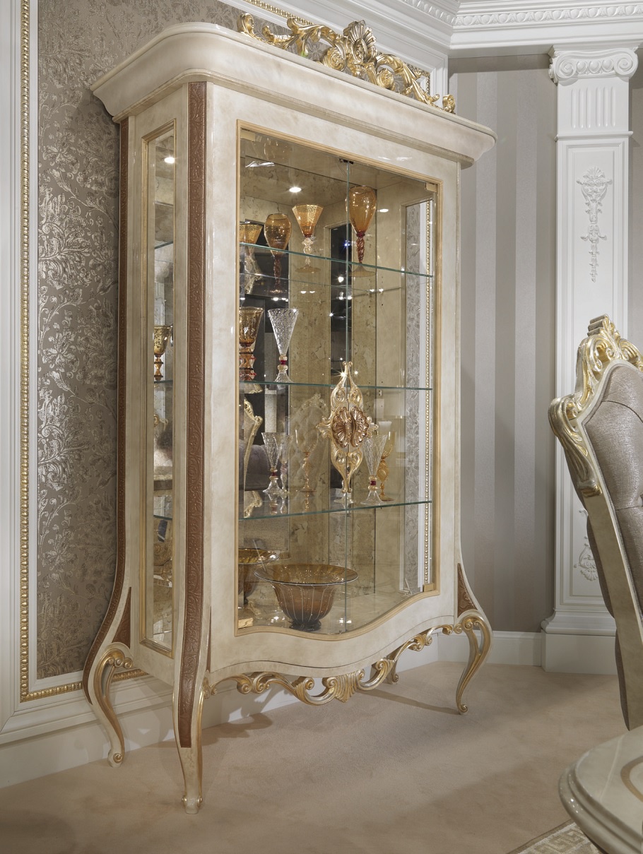 Showcase of Baroque from the Italian manufacturer Turri. The frame is made of wood. Shutters, shelves made of tempered glass. The back wall is mirrored. Decorations are hand carved and leather inserts treated by a stamping technology, which provided relief pattern. Showcase is made in the Baroque dining room set included in this collection. A perfect choice for a living room, dining room. The model can be illuminated upon request.