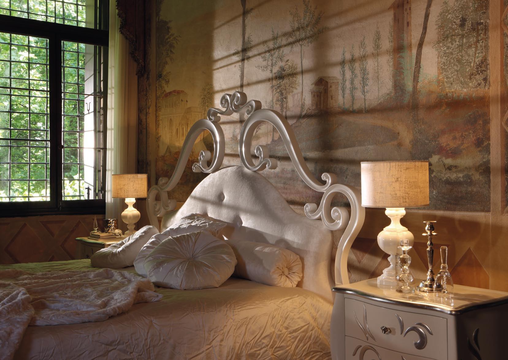 Double bed, with high headboard from delicate Italian producer Giorgio Piotto. The frame is made from solid wood, finishing in white lacquer. Upholstery - textiles from the company's range, the filler is polyurethane foam. High quality model, characterized concise design.