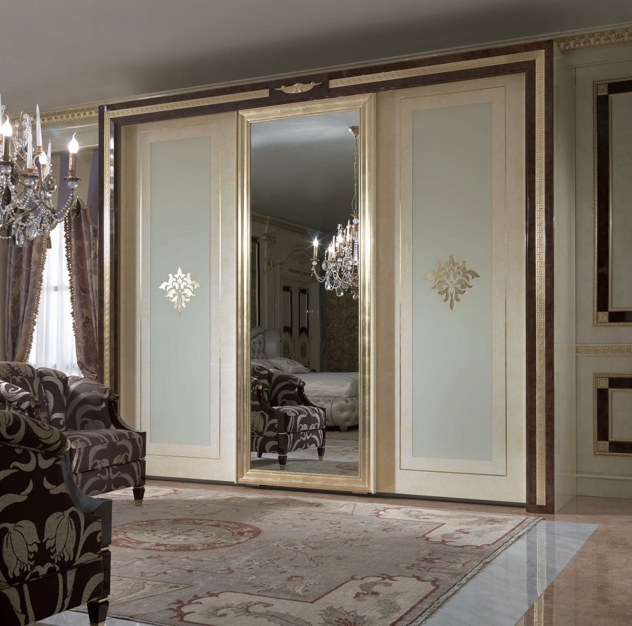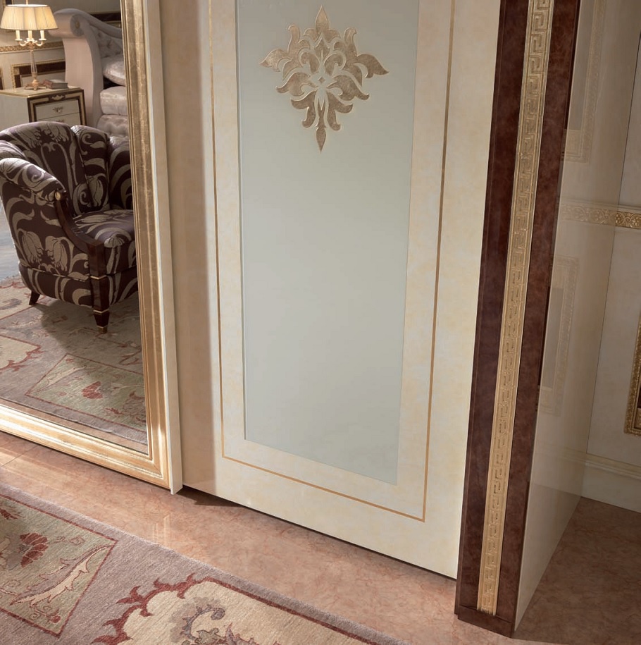 Wardrobe Hermitage from the Italian manufacturer Turri. The frame is made of wood. The handmade decor. Finish - gloss polyester, beige with a pattern of tree root. The Central door is made with mirror and side doors with coloured glass and with decoration of gold foil on the glass. The inner part of wood. Internal fittings: 3 wooden shelves and 4 hangers gilded. Wardrobe with 3 sliding doors made in the classic style.