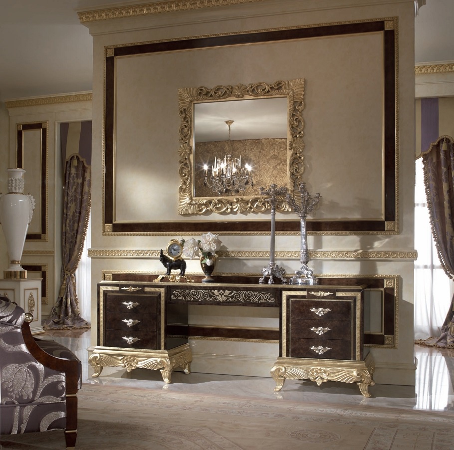 Hermitage dressing table from the Italian manufacturer Turri. The frame is made from wood with base in solid wood and hand carved. The handmade decor. Finish - gloss polyester, dark brown color with a pattern of tree root. Dressing table with 4 drawers perfectly complement the classic interior.