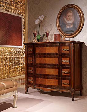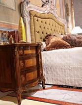 Headsets for bedrooms Zona notte Antica Brianza from Italian manufacturer Minotti Luigi & Benigno. The model consists of a double bed, two bedside tables, chest of drawers and dressing stools. For the manufacture of products used solid wood. Finish - veneer. Upholstery textile is proposed. The product is decorated with carving and gilded elements. Set is made in a classic style.