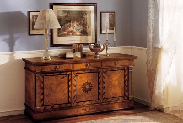 Biedermeier sideboard Credenza from Italian manufacturer Minotti Luigi & Benigno. The model consists of drawers and closed sections for storage. The frame is made from solid wood. Finish - veneer. The model is made in classic style. Decorate the interior of your home.