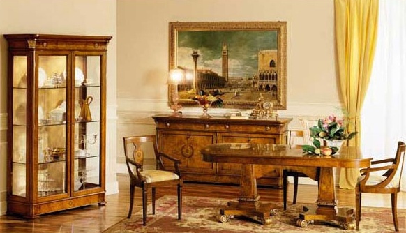 Furniture set for dining room Domus Sala from Italian manufacturer Minotti Luigi & Benigno. Includes folding dining table made from solid wood. Used surface increases due to additional pull-out top. Showcase made also from the array, the sash and glass shelves. The model is equipped with a backlight. The chairs are available with or without armrests in upholstery fabrics from a range of companies. The Cabinet consists of drawers and sections for storage made of wood. Finish - veneer. The set is made in a classic style.