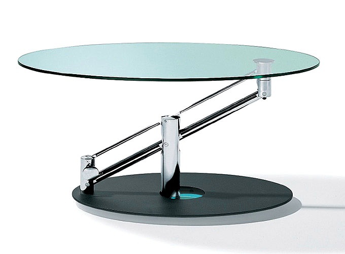 Coffee table from German manufacturer Ronald Schmitt. Coffee table with height adjustment. Fixed in any position using the jog control. Built-in interlock system prevents accidental lowering of the top. The table top is made from shatterproof glass. Leg and support top chrome-plated metal.