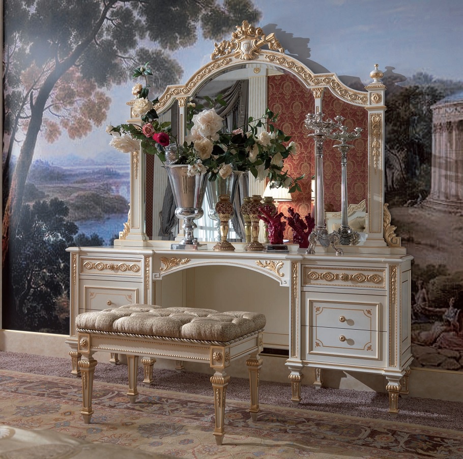 Tosca dressing table from the Italian manufacturer Turri. The frame is made of wood. The handmade decor. The finish is a matte coated lacquer ivory. Dressing table with 6 drawers perfectly complement the classic interior of the bedroom.