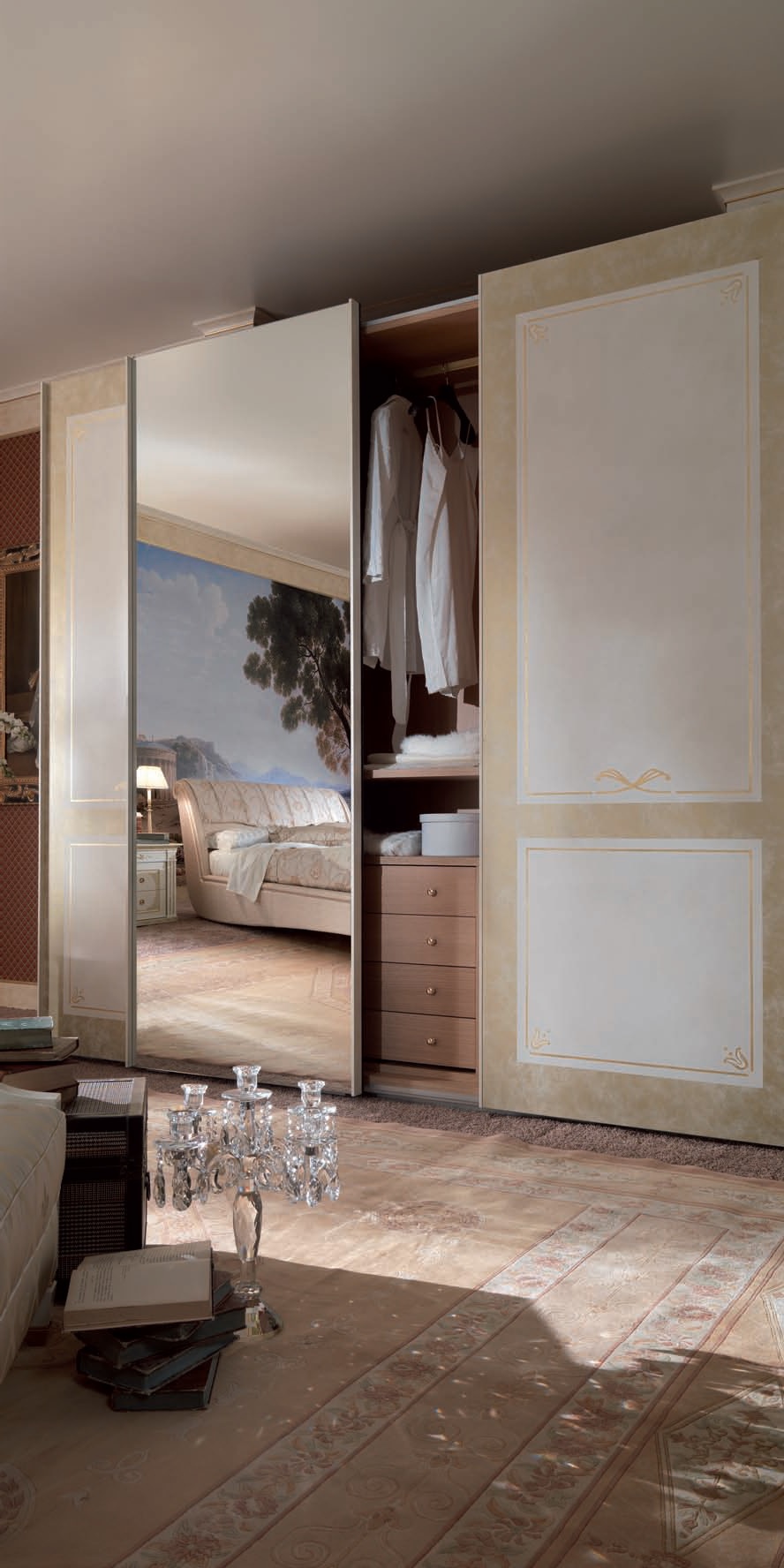Wardrobe Exedra from the Italian manufacturer Turri. The frame is made of wood. Decor handmade, 3 sliding doors with middle mirrored door. The inner part is made of wood. On request, all 3 doors mirrored or wood. Internal fittings: 3 wooden shelves and 4 hangers gilded. The product is made in a classic style.