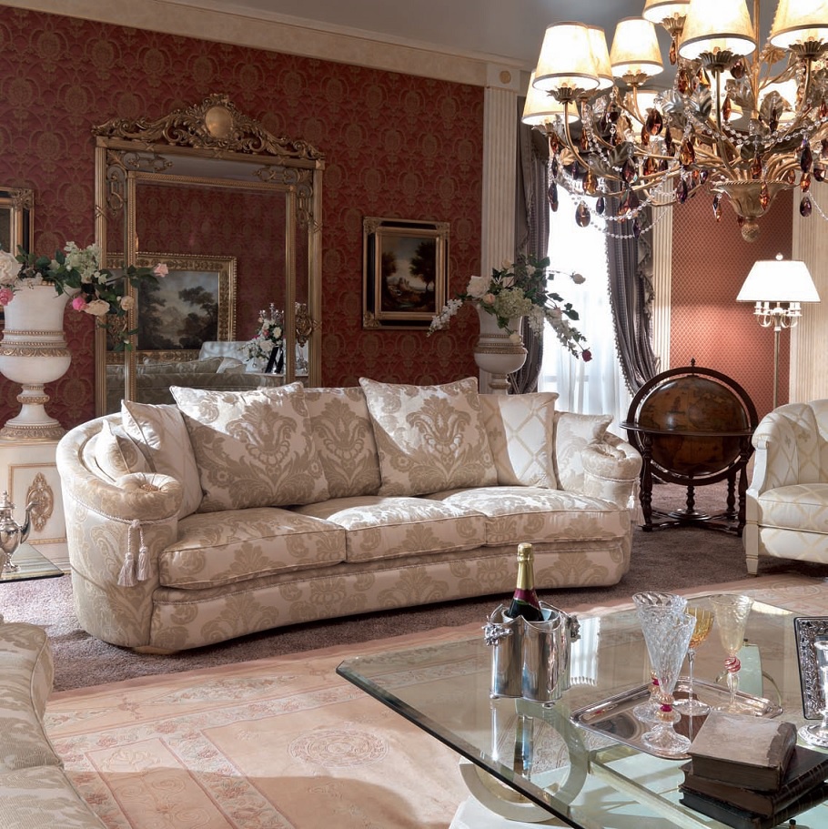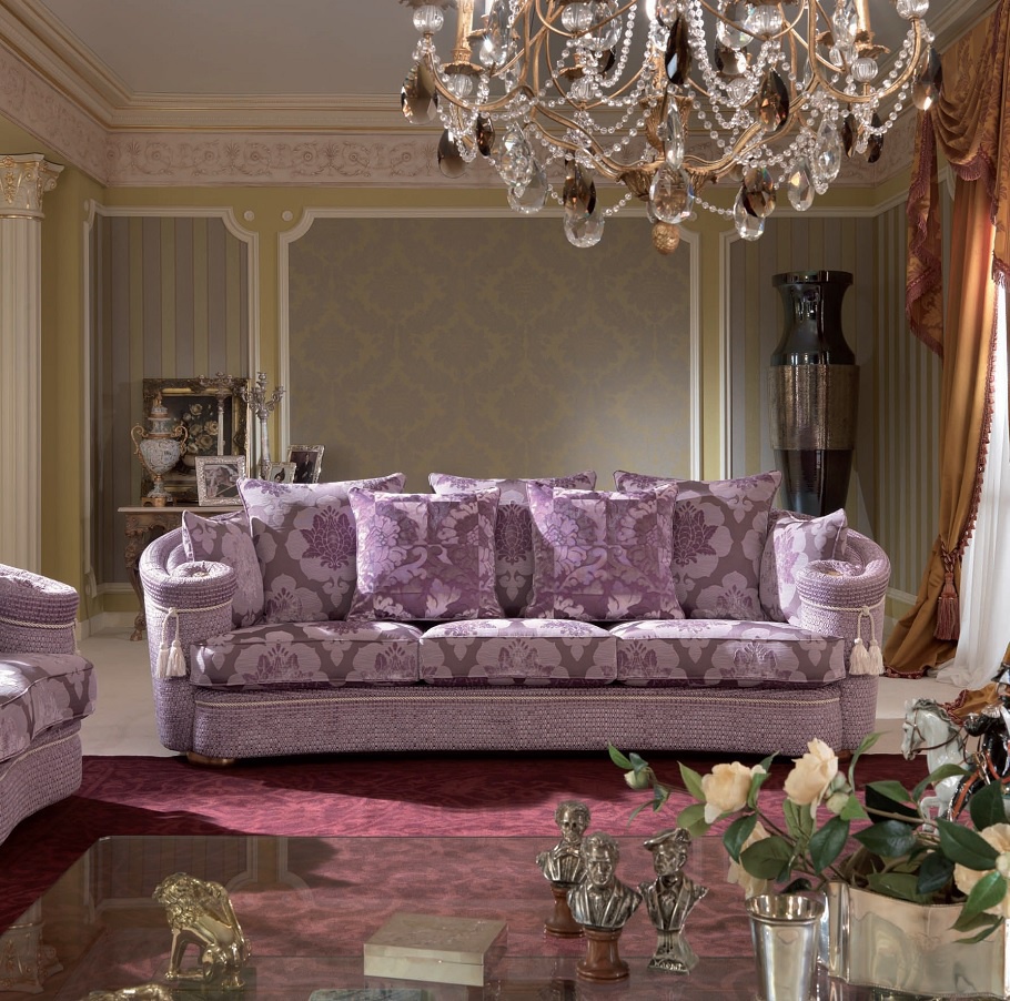 Three-seater sofa Milo from the Italian manufacturer Turri. The model in the hidden frame. Back smoothly into the curved armrests in the form of scrolls, decorated on the perimeter of the braided edging and tassels of textile. Seat cushion is removable. Additional support for the back are soft cushions covered with cloth in the tone of the fabric. Legs - gold plated. The model will perfectly complement the classic interior of the living room.