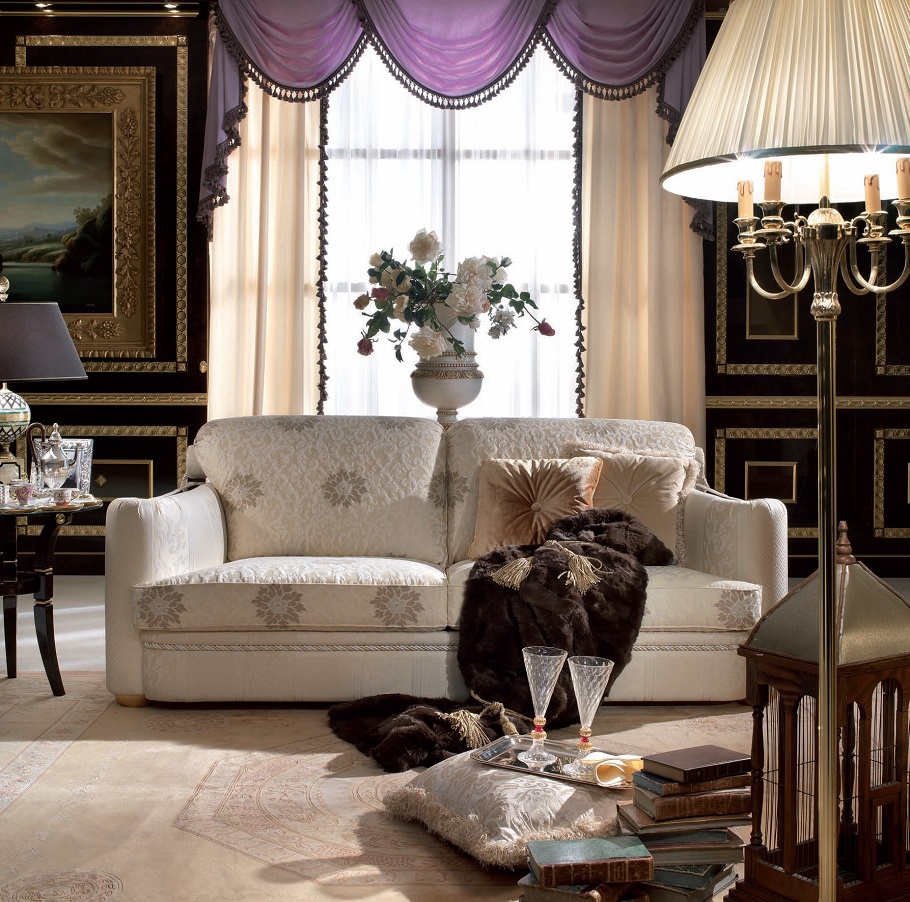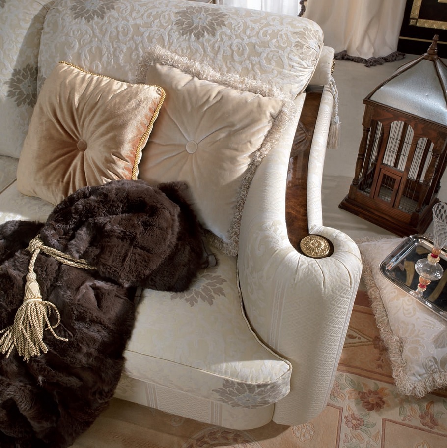 Sofa double Berry from the Italian manufacturer Turri. The frame is made of wood. Armrests with wooden detail. The handmade decor. Finish - gloss polyester, brown with effect tamponato. The armrests smoothly into the curls. The backrest rests on a decorative cushion. The sofa will perfectly complement the classic interior of the living room.