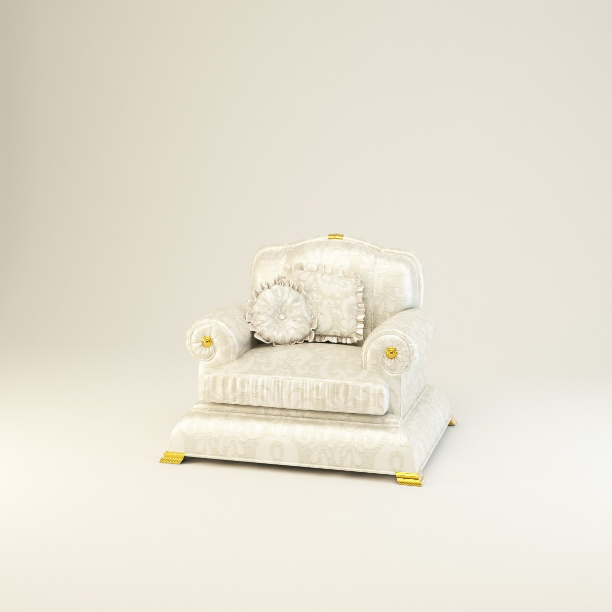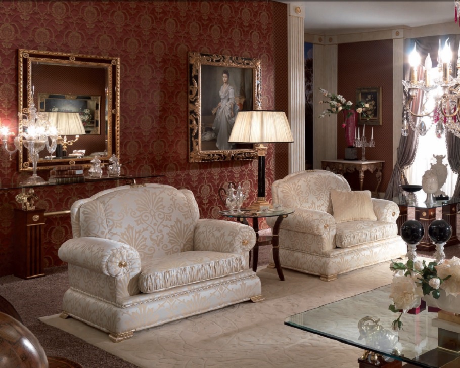 Capitol a chair from the Italian manufacturer Turri. The frame is made of wood. Upholstery – textiles. The armrests smoothly into the curls. The model is decorated with a rope edging. Design gives the solidity. The legs are made of brass. The chair is made in a classic style.