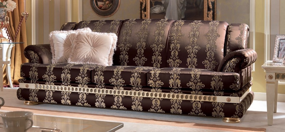 Sofa Plus triple Embassy from the Italian manufacturer Turri. The frame is made of wood. Upholstery – textiles. Base with wooden detail with built-shaded glasses. The handmade decor.Finish - gloss polyester, color ochre with effect tamponato. The model is made in classic style.