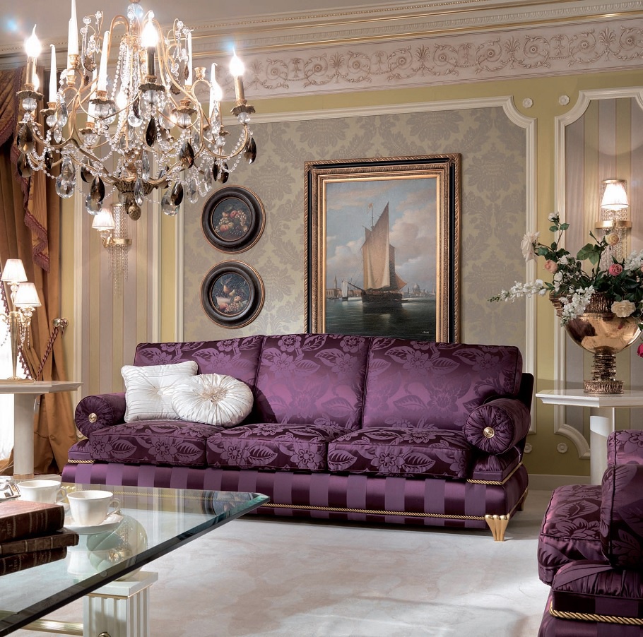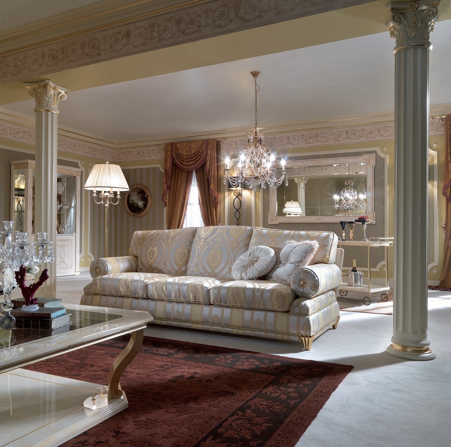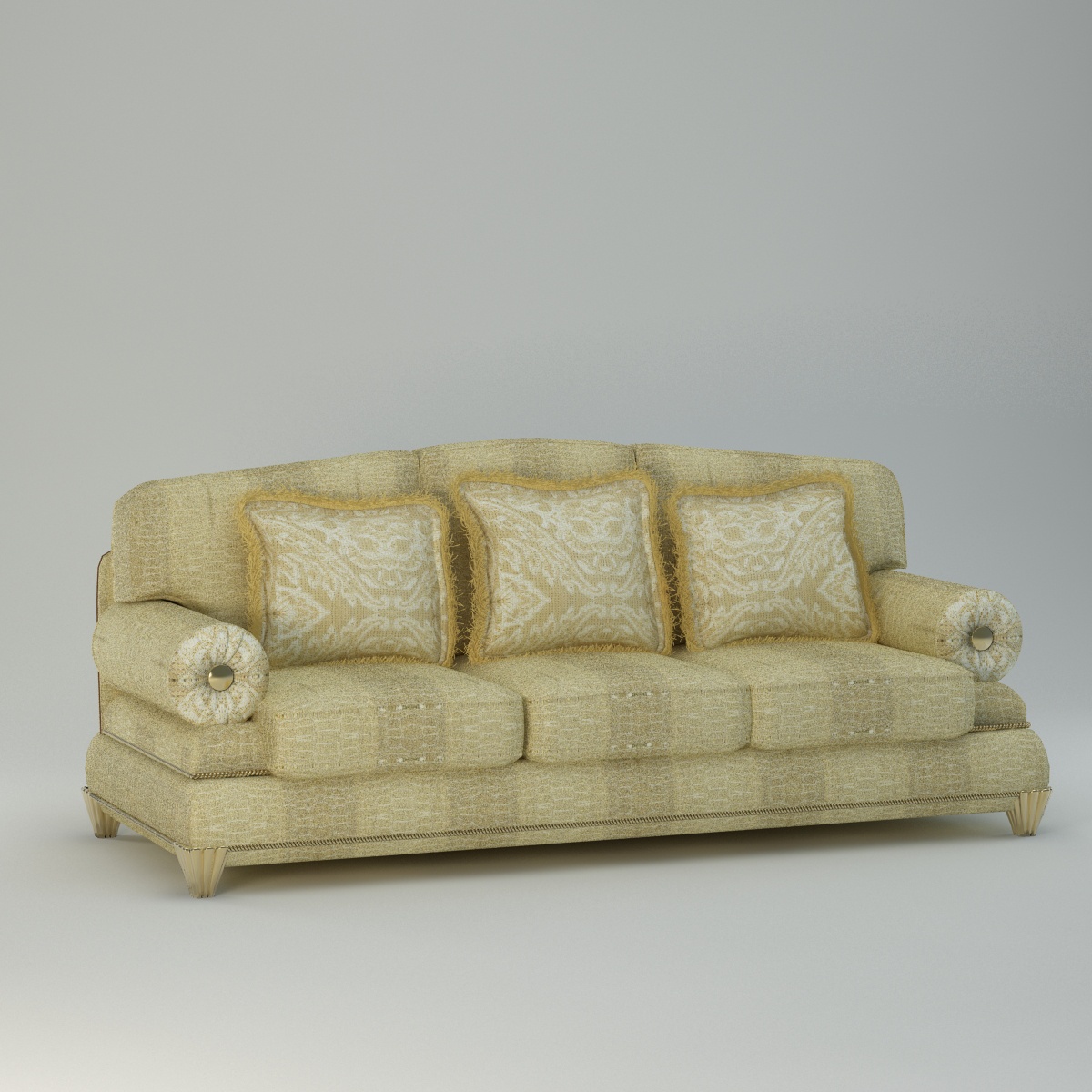 Triple Royale sofa from Italian manufacturer Turri. The frame is made of wood. Upholstery – textiles. The legs are made of brass. The armrests are made in the form of rollers. The model is decorated with a rope edging. Sofa in classic style.
