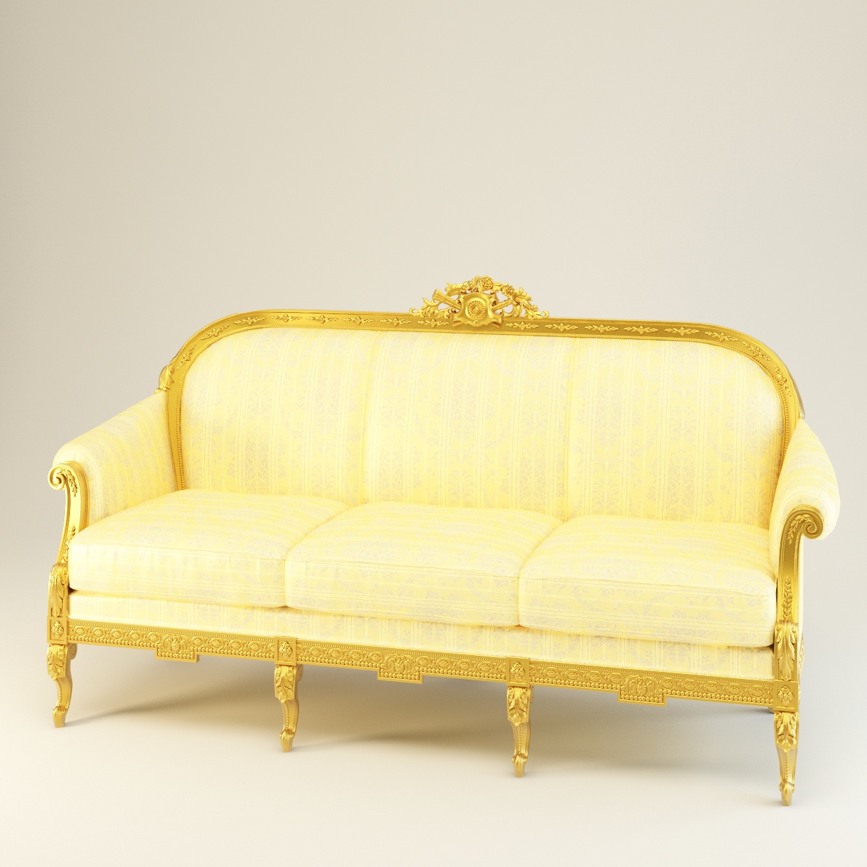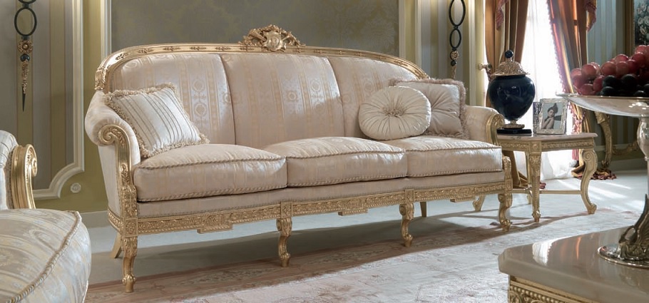 Otello three-seater sofa from Italian manufacturer Turri. The frame is made of wood. Upholstery – textiles from the company portfolio. The frame of the sofa is complemented by hand carved. Colors - white and Golden. Sofa in classic style. Can be supplemented with an armchair from the same collection.