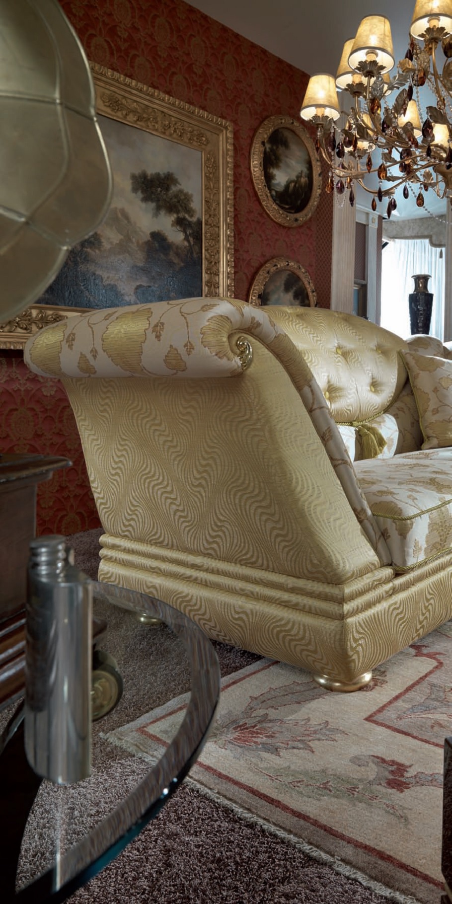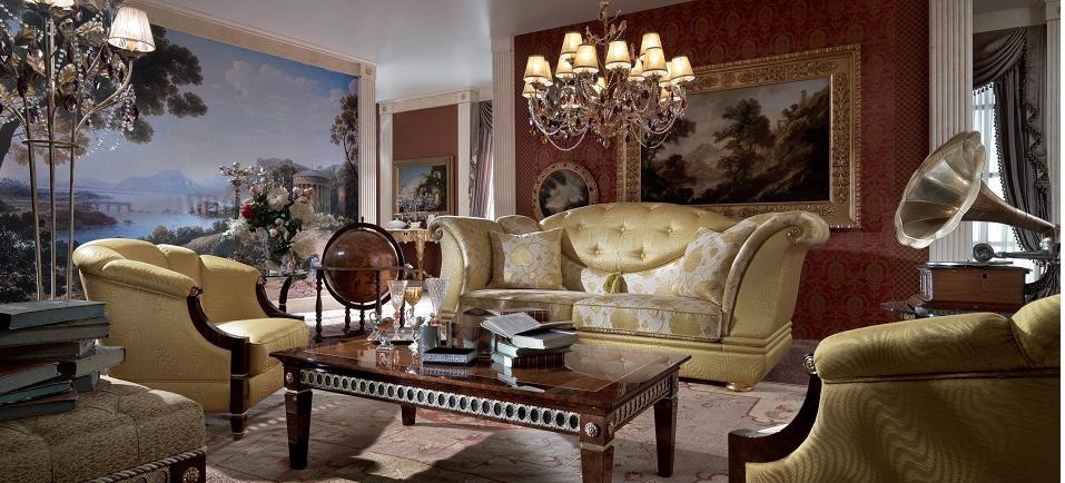 Olympus double sofa from Italian manufacturer Turri. The frame is made of wood. Upholstery – textiles. The handmade decor. Finish - gloss polyester, wood color root effect the main ha long Bay. Decorative details made of gold foil. The lugs on the legs of shiny brass. The model is made in classic style, the perfect choice for the living room.