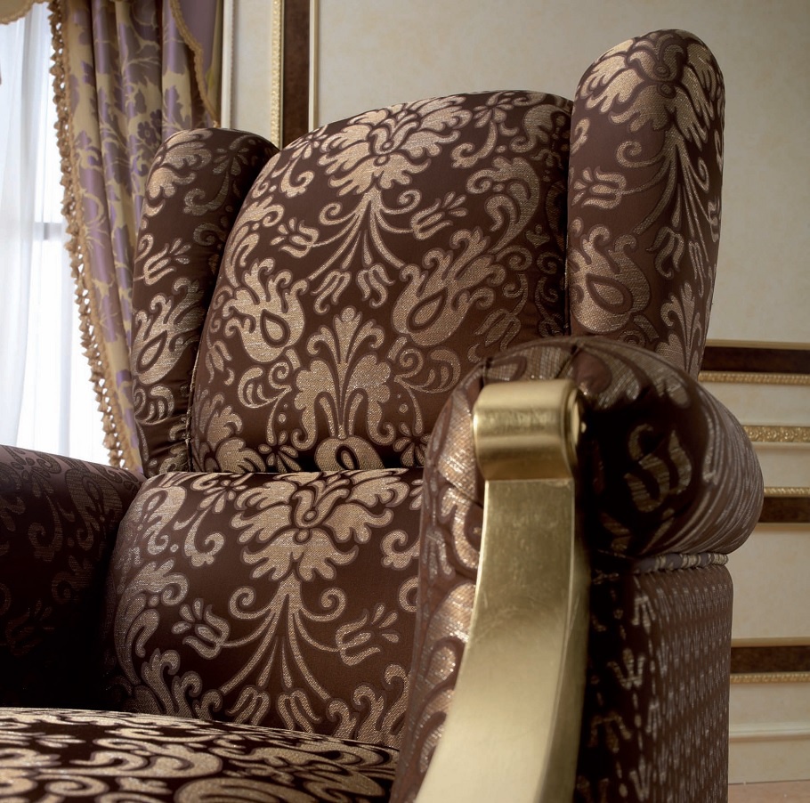 The Meris chair from the Italian manufacturer Turri. The structure is made of solid wood. The handmade decor. Finish - gloss polyester, gilded. Tips on the legs are made of shining brass. The model will perfectly complement the classic interior of the living room.