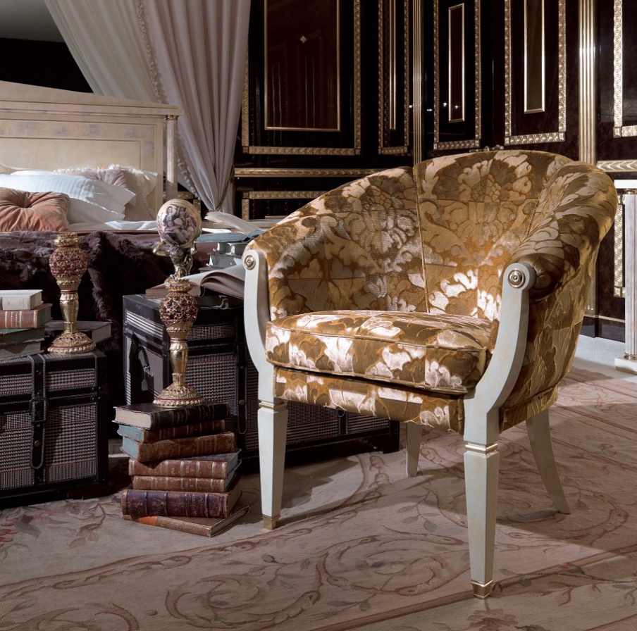 Mirby chair from the Italian manufacturer Turri. The structure is made of solid wood. The handmade decor. Finish -gloss polyester, beige with a pattern of tree root. The back is curved wood with vspenennaja gasket. The tripod is made of shiny brass. The model is made in classic style, the perfect choice for the living room.