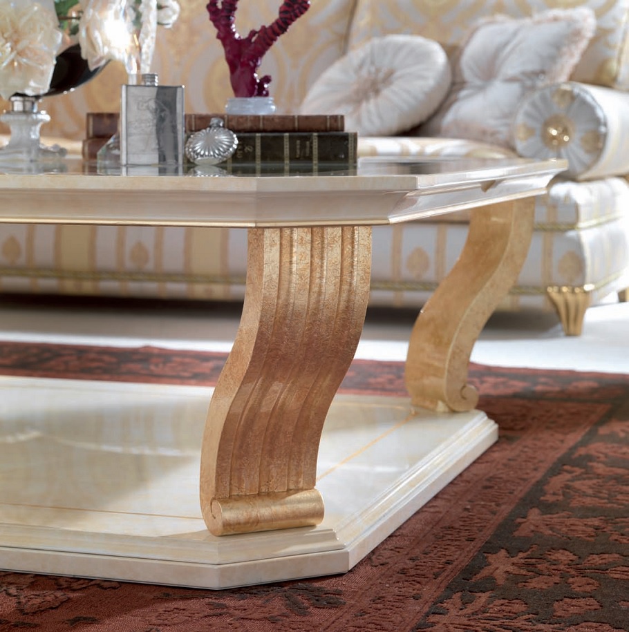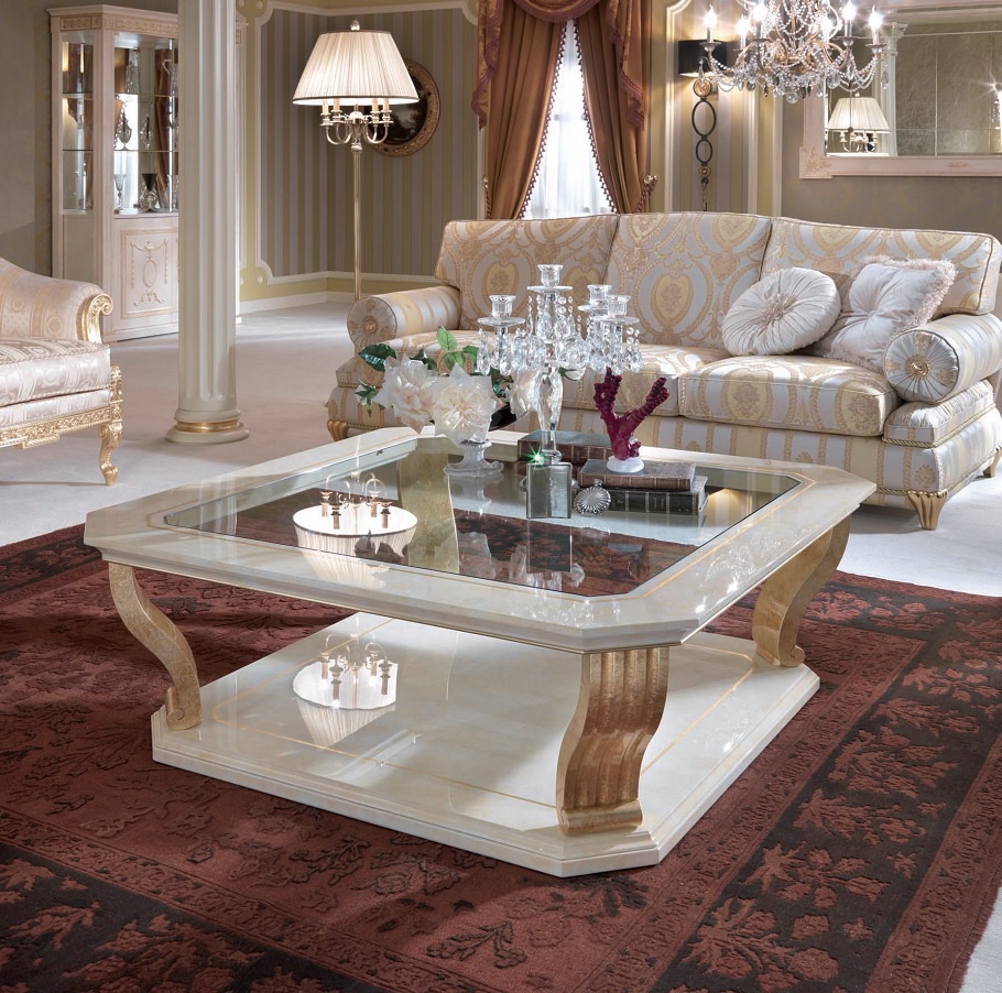 The Arcade square coffee table from Italian manufacturer Turri. Structure made of solid wood, hand decorated, gloss polyester finish color beige /brown. There are metal parts made from brass. Decorative wood profiles with decoration of gold foil artificially aged. Table top inlaid with glass that gives lightness to the product, despite the massive legs. The product will decorate the living room in a classic style.