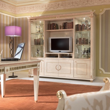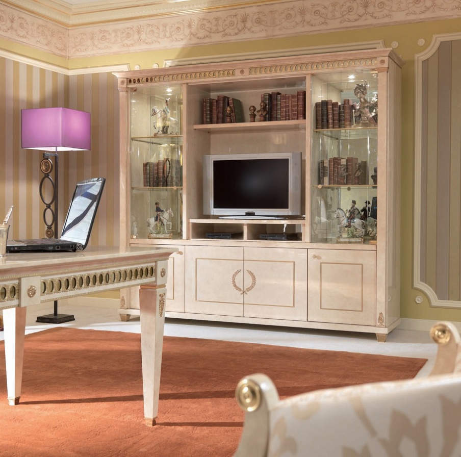 Bookcase Arcade Plus Turri Italian manufacturer. The frame is made of wood. The handmade decor. Finish - gloss polyester, color screen to the main ha long Bay effect. The upper part is suitable for TV. Side doors with glass and decorative engraving. Side of the rear wall mirror. Internal glass shelves made with decorative brass profiles. Built-shaded mirror, lugs on the legs and Capitalia of brass casting. Halogen lights in the upper plane are available on request. Bookcase with 4 doors perfectly complement the classic interior of the Cabinet.