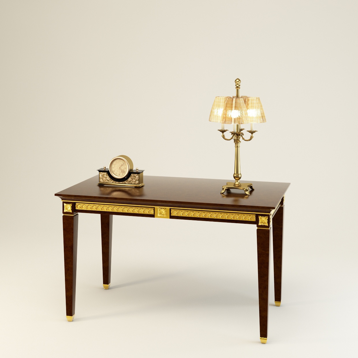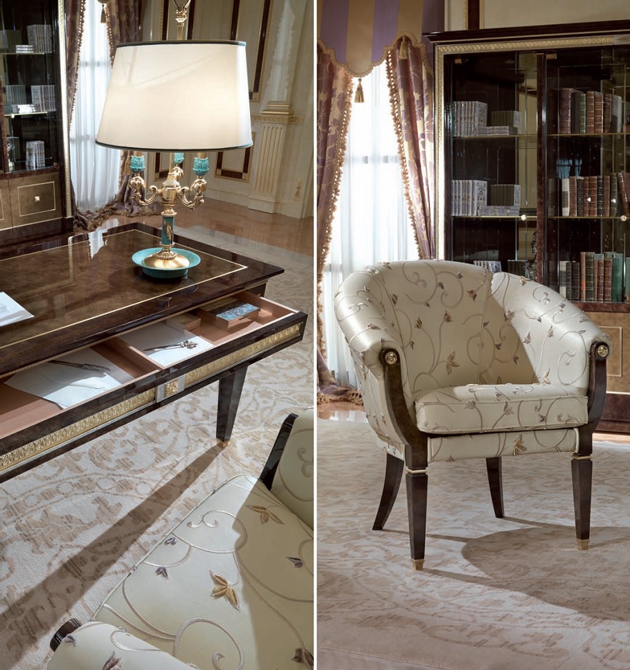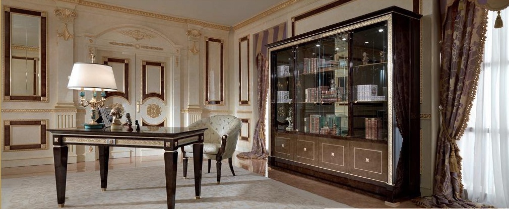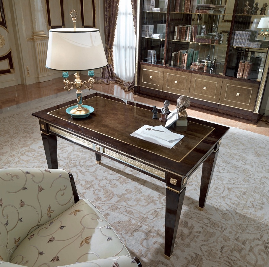 Desk Arcade Royale from the Italian manufacturer Turri. The frame is made of wood. The handmade decor. Finish - gloss polyester, in dark brown with a pattern of tree root and brown pattern tree root. Decorative details made of brass. Desk with 2 drawers made in the classic style.
