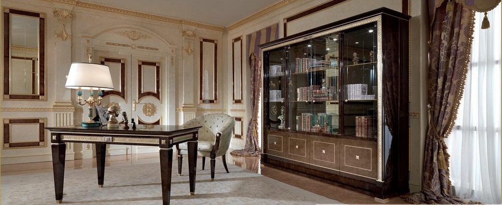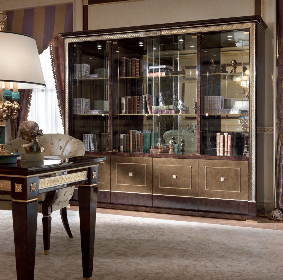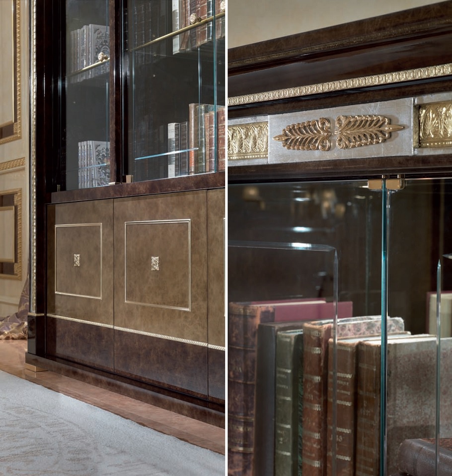 Showcase Arcade Royale from the Italian manufacturer Turri. The frame is made of wood. The handmade decor. Finish - gloss polyester, in dark brown with a pattern of tree root and brown pattern tree root. Upper glass doors with decorative engraving. Internal glass shelves with decorative brass profiles. Mirrored back wall. Decorative details are made of brass. Halogen lights in the upper plane are available on request. Showcase with 4 glass doors made in the style of art Deco.