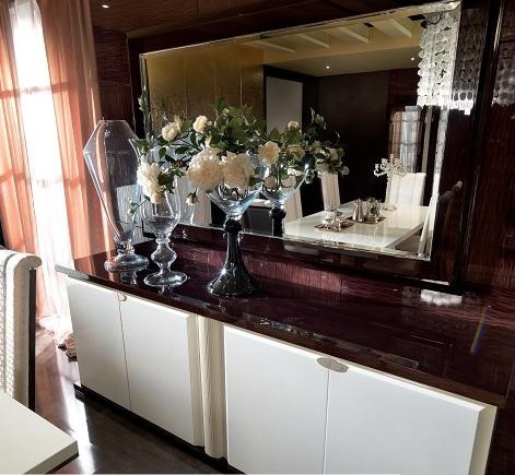 A chest of drawers from Italian manufacturer Turri. The frame is made of wood. The handmade decor. Finish - gloss polyester, dark brown with a striped effect and a white effect tamponato. 4 door wardrobe made in a modern style.