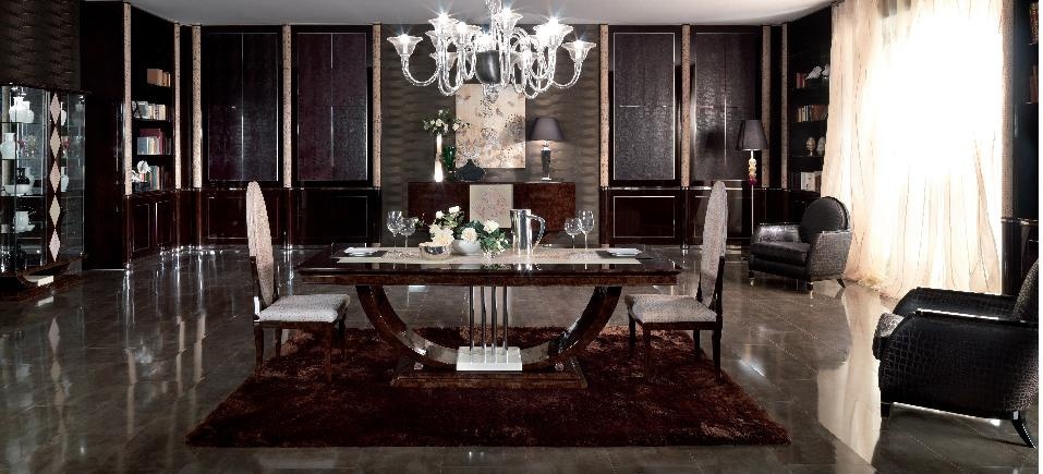 Dining table from Italian manufacturer Turri. The frame is made of wood. The handmade decor. Finish -gloss polyester, dark brown with a pattern of tree root and beige striped effect. Leather appliques complement the design model. Top supported by metal and wooden round legs connected by a Foundation of wood.