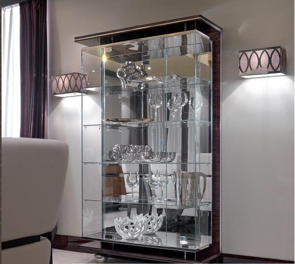 Showcase, from the Italian manufacturer Turri. The frame is made of wood. The handmade decor. Finish - gloss polyester, dark brown with a striped effect. The door is made of tempered glass. Internal glass shelves and mirrored back wall. Halogen lighting in the upper plane are available on request. The frame legs in the form of balls. Showcase with 1 door made in a modern style.