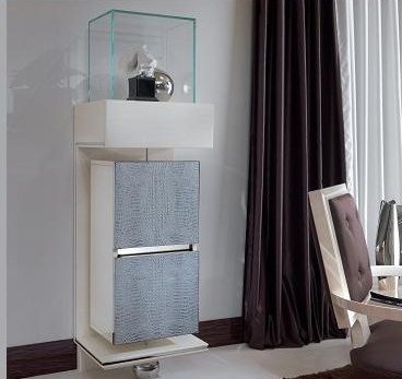 Showcase, from the Italian manufacturer Turri. The frame is made of wood. The handmade decor. Finish - gloss polyester, in ivory with a striped effect. Leather appliques complement the design model. Showcase with 2 doors and 1 drawer and a glass container made in a modern style.