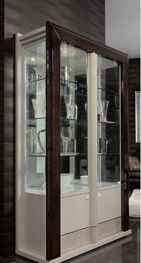 Showcase, from the Italian manufacturer Turri. The frame is made of wood. The handmade decor. Finish - gloss polyester, sand-coloured effect tamponato. Portal black striped effect. The lower door is made of wood. Top door made of tempered glass. Internal glass shelves and mirrored back wall. Halogen lights in the upper plane on request.