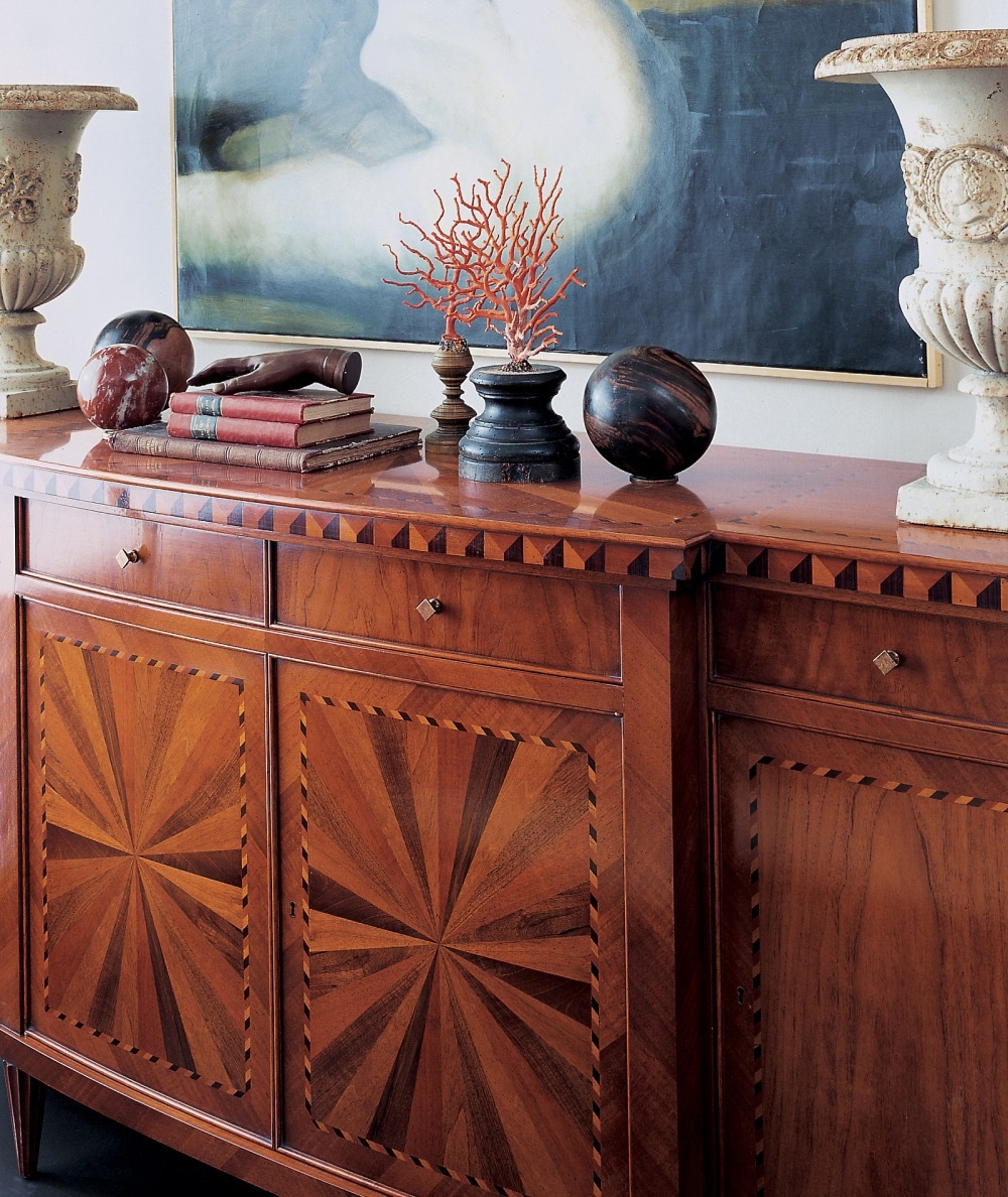 The snack bar by Italian manufacturer Annibale Colombo. The body of the sideboard is made of walnut wood. Decorated with inlaid veneer. Model with hinged doors and drawers. Product color - brown.