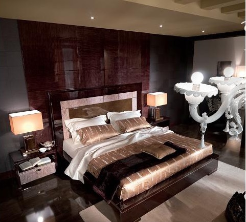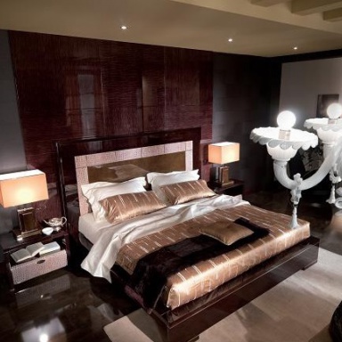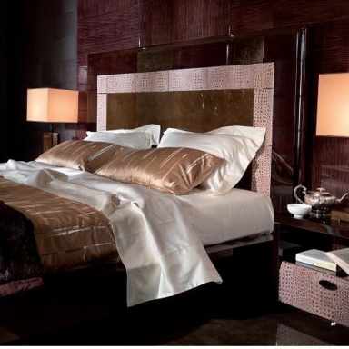 Double bed, from the Italian manufacturer Turri. The frame is made of wood. Wooden headboard and side-bar. The handmade decor. Finish - gloss polyester, dark brown with a striped effect and brown effect tamponato. Leather appliques complement the design model. Orthopedic mesh is made of wooden slats.