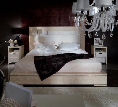 Double bed, from the Italian manufacturer Turri. The head frame and the underframe is made of wood. The handmade decor. Finish -gloss polyester, beige with striped effect and a white effect tamponato. Leather appliques to complement the decor of the model. The bed is designed in modern style.