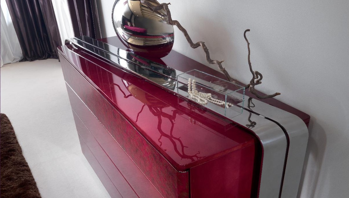 A chest of drawers from Italian manufacturer Turri. The frame is made of wood. The handmade decor. Finish - gloss polyester, Burgundy tamponato effect. Leather applique in contrast color gives the model refinement. Chest of 4 drawers with chrome strip and a small glass container. made in a modern style