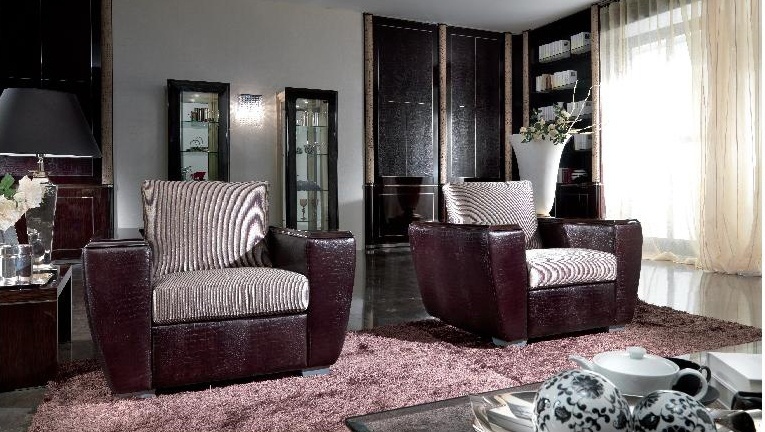 Armchair, from the Italian manufacturer Turri. The frame is made of wood. Upholstery - leather and textile. Wooden armrests and back. The handmade decor. Finish - gloss polyester, dark brown with a striped effect. The model is made in modern style.