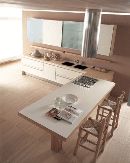 Kitchen from Italian manufacturer Effeti. Kitchen in a modern style. Facades of laminated, finish cherry, beech or oak. The working area is stainless steel. The feature of the kitchen - cooking area that opens to a dining. Set is completed with a wide hinged shelf.