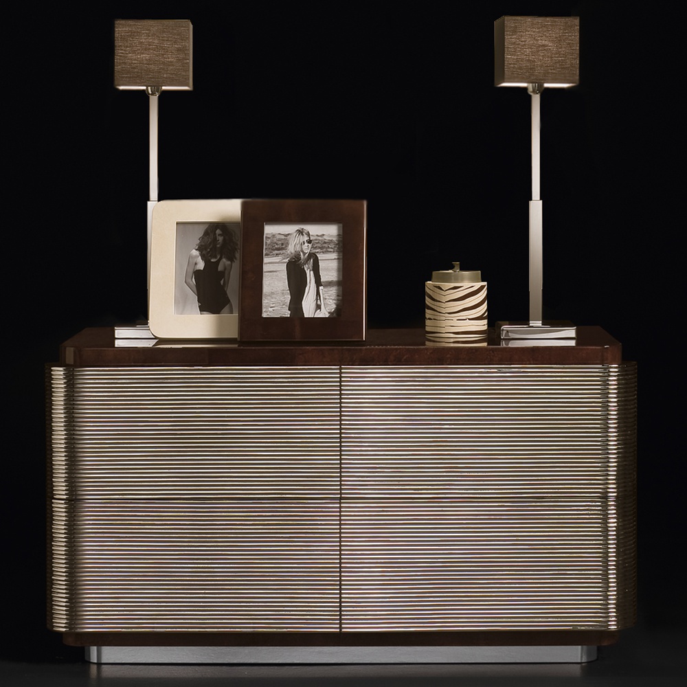 A chest of drawers from Italian manufacturer Tura. The frame is made of wood. The model rests on a metal base. The facade of the drawers are adorned with decorative elements. The model is hand-made in art Deco style.