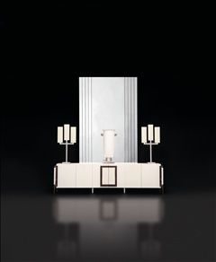 A chest of drawers from Italian manufacturer Tura. The frame is made from solid wood. The model is based on wooden legs. Side feet continue to element of the decor. The dresser consists of 6 doors. Average doors incorporate ornamental rectangle. On the sides of the frame and decorative inserts. The model is hand-made in art Deco style.
