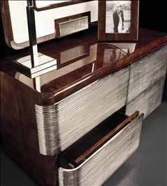 A chest of drawers from Italian manufacturer Tura. The frame is made from solid wood. The model is based on a metal and wood base. The facade of the drawers are adorned with decorative elements. The model is hand-made in art Deco style.
