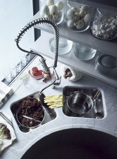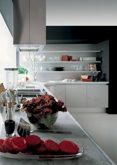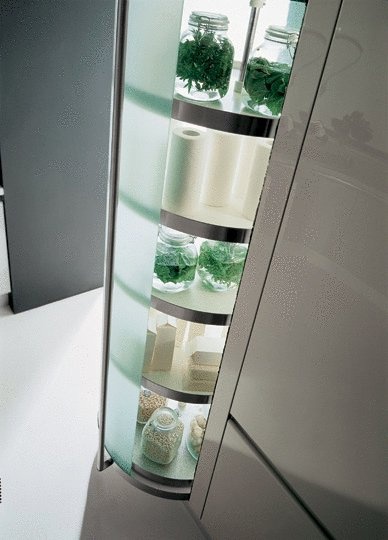 Kitchen with island Misura from the Italian manufacturer Effeti. Kitchen in a modern style. The most functional kitchen made of solid oak and lacquered white. Work area - marble white. In addition, it is proposed oval storage with glass doors. A special feature is the absence of handles, which replace the cavities in the doors.