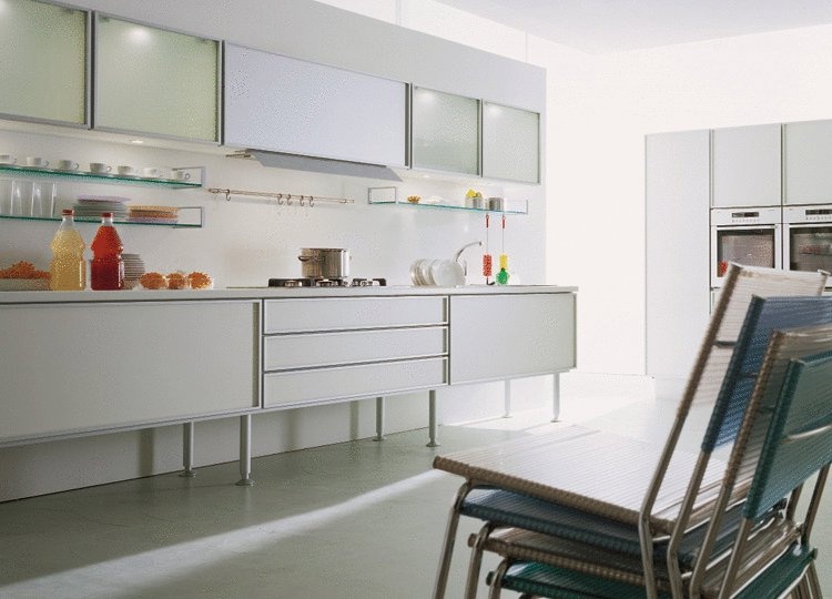 Quadra kitchen by Italian manufacturer Effeti. The most functional kitchen in a modern style. Frame of stainless steel. The facades according to the customer - open and blind, solid wood, glass or stainless steel. The working area is stainless steel. Wall cabinets can be fitted with internal lighting.
