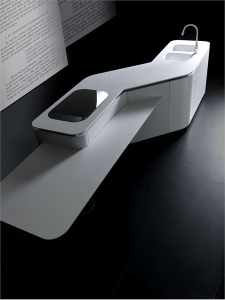 The island kitchen from Italian manufacturer Effeti. Kitchen in the style of hi-tech, high-tech style propagandizing aesthetics of the material, this style is for people young at heart. The module has an extravagant form, can be combined with garnitura Evoluzione to create configurations with multiple curves. Made only of the most modern materials. The island base module is made of plastic. There is a possibility of tinting in all shades from the collection company. Worktop from artificial stone Cristalan. Notches in the trim polished aluminum replace handle.