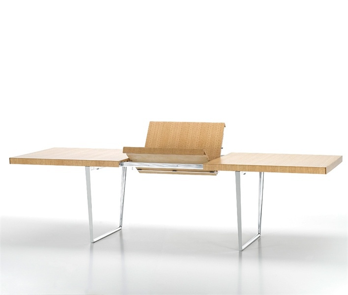 Dining table Extendable Dinning Table from Swiss manufacturer Vitra. The model is made with a wooden top and additional counter tops. Frame with cross bar made of chrome-plated aluminum. The model is designed for 6-10 people.