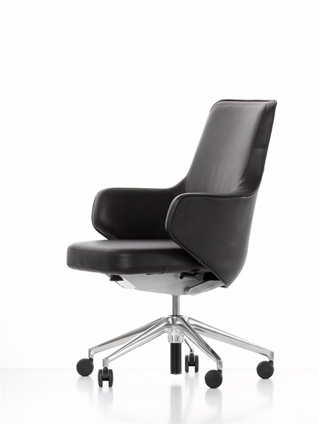 Skape chair from Swiss manufacturer Vitra. The base is made of metal. Five-way base is equipped with wheels. The backrest with the armrests to form the shape of a shell. Seat height is adjustable with gas-lift. The upholstery is made of leather. the model is made in modern style.