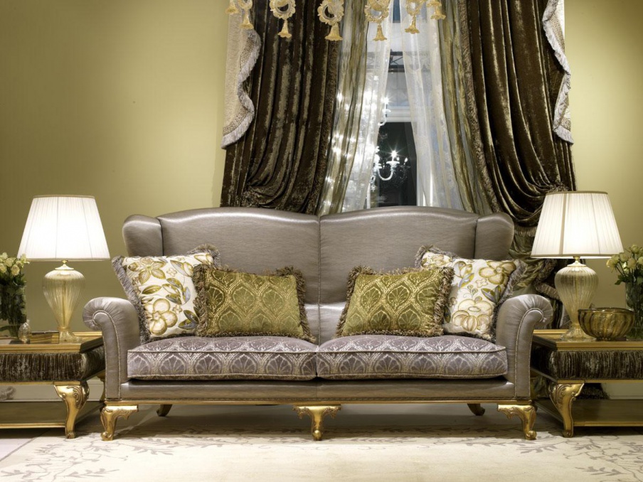 A double sofa from Italian manufacturer Bruno Zampa. The model is made on a frame of wood. Legs painted in Golden color. Feature models high back fully covered textiles. Color option - gray. Model complement the decorative pillows.
