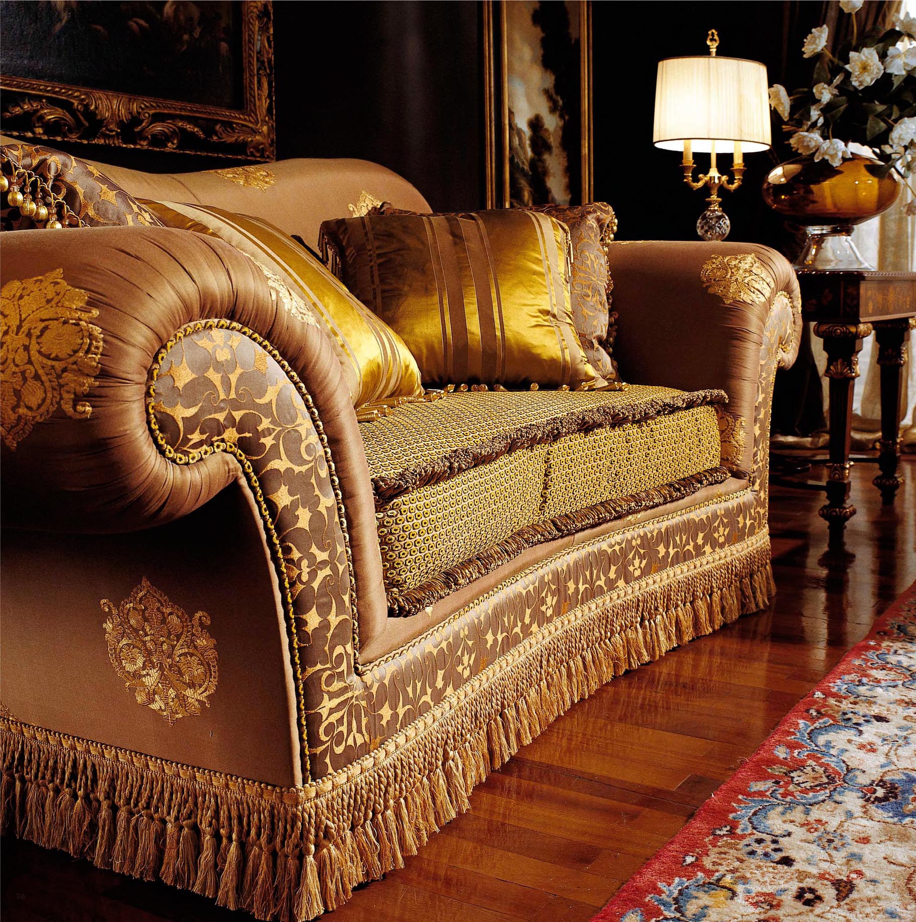 Sofa from Italian manufacturer Armando Rho. Upholstery made of silk, filling - foam/feather. The perfect choice for a living room in classic style. The design of complementary decorative pillows. Colours in stock.