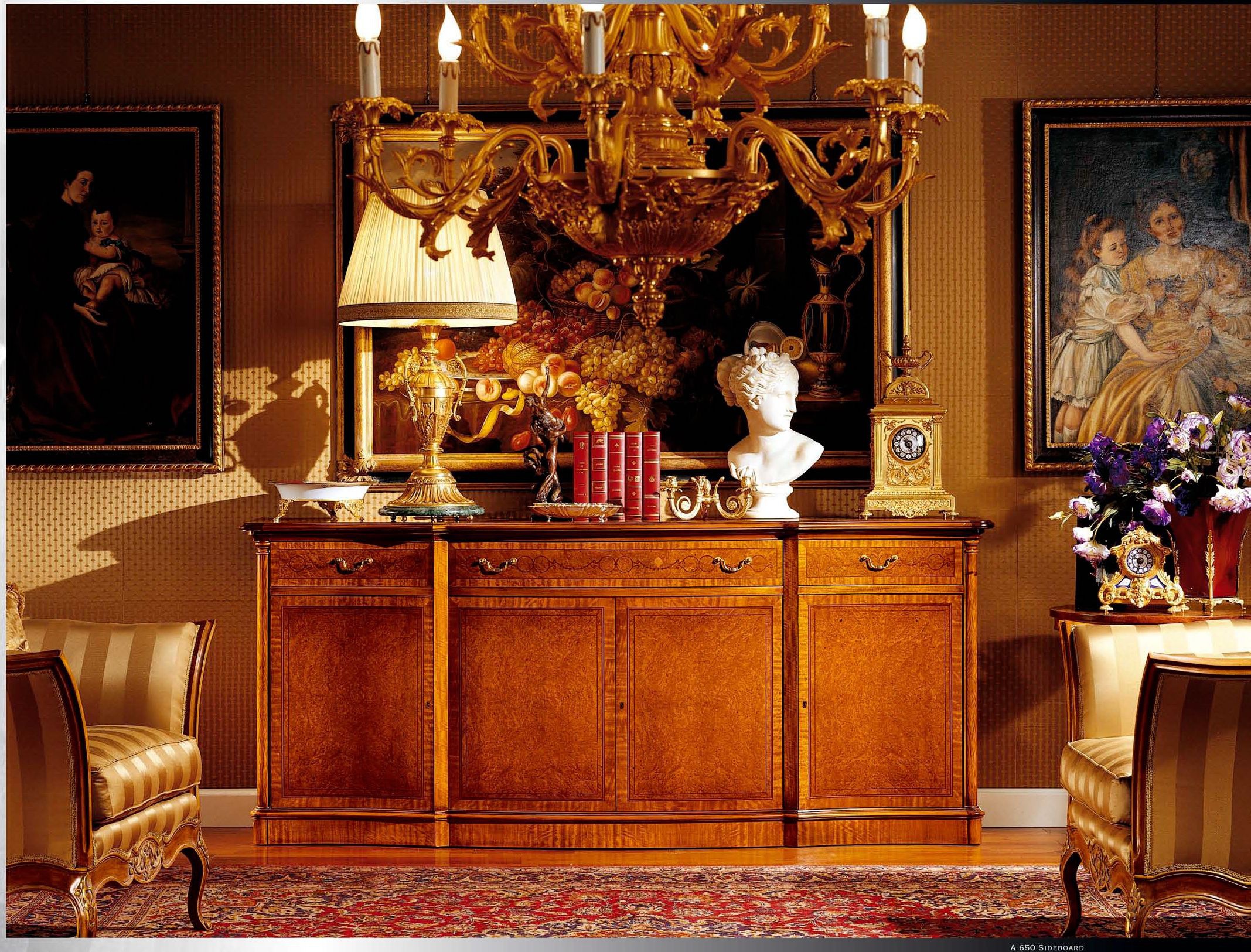 Sideboard from Italian producer Armando Rho. The frame is made of mahogany/walnut/maple. Decorative accessories - metal. Model with three drawers of different size and four doors. The perfect choice for dining room or living room in classic style. Product color natural wood.