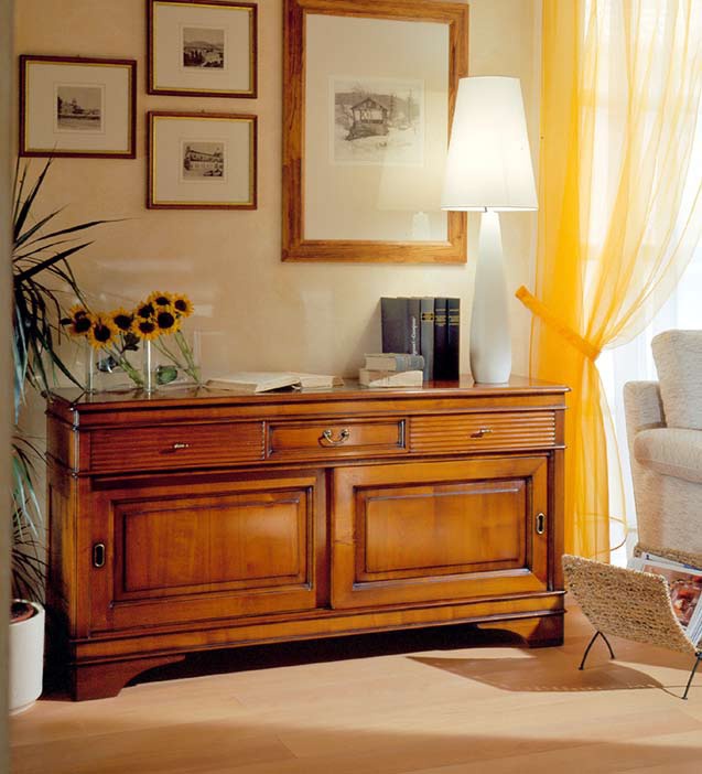 The low lying chest of drawers from Italian manufacturer Busatto. The model is composed of drawers and shelves with blind doors. Dresser made entirely of solid wood. The finish offers a glossy varnish. The offered fittings from metal. The chest is made in a classic style. Will perfectly fit the interior of your home.