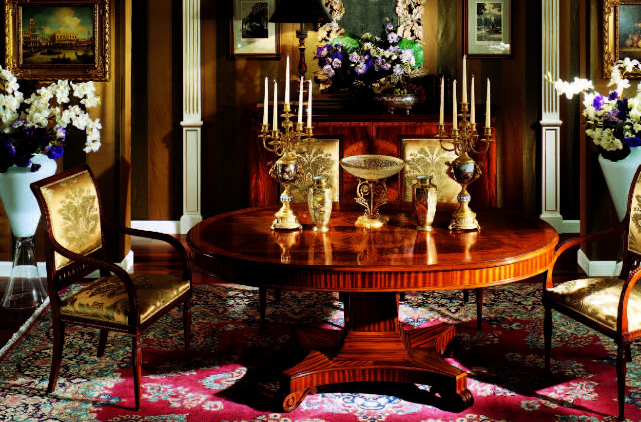 Dining table from Italian producer Armando Rho. The model is made from solid mahogany in a lacquer finish, insert - the array of maple. A perfect choice for a dining room in classical style. Product color natural wood.