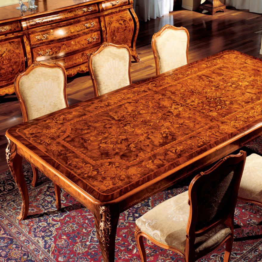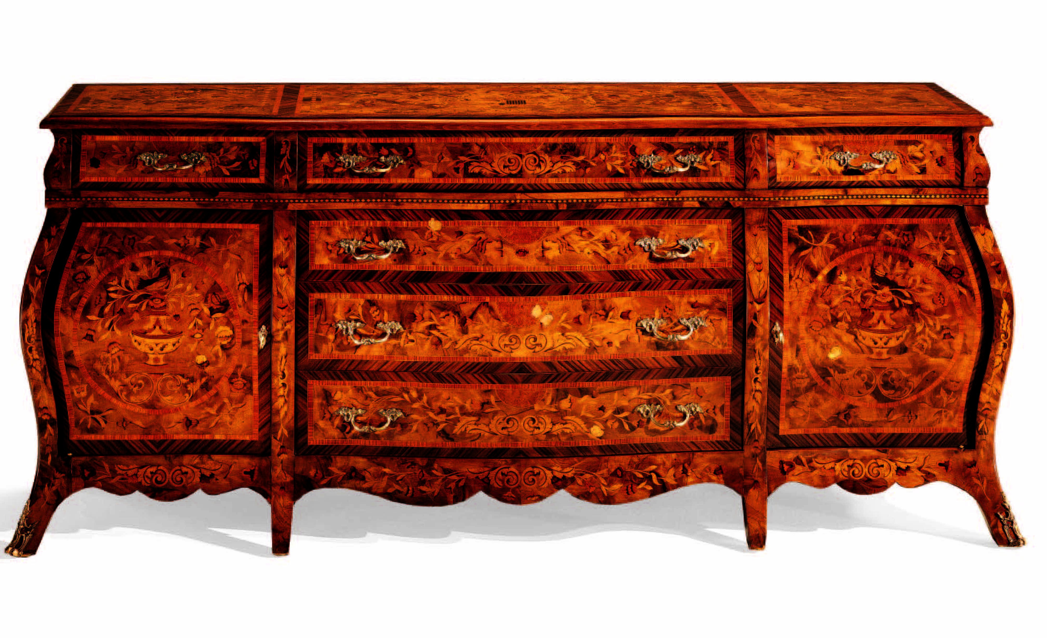 Sideboard from Italian producer Armando Rho. The model is made from solid wood, inset with maple/rosewood/walnut finish marquetry. Decorative accessories - metal. Sideboard with drawers of different sizes. A wonderful choice for the dining room in a classic style. Product color natural wood.