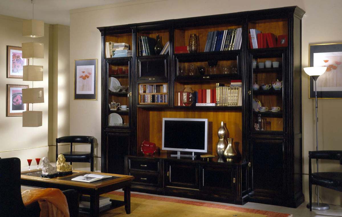 Modular system from Italian manufacturer Busatto. The model includes open and closed shelves, drawers and space for TV. Material - solid wood. Finish available in black. Accessories made of metal. The sash is made of transparent glass. The model has storage capacity and compactness.